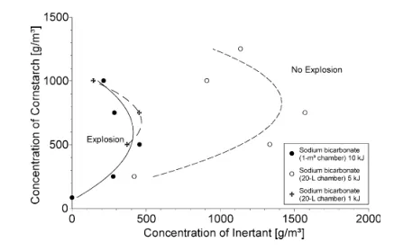 圖 8匹茲堡用MAP惰化的粉煤在不同點火能量下的1 m 3和20 L室惰化曲線的比較(來自Dastidar&Amyotte,2002)。