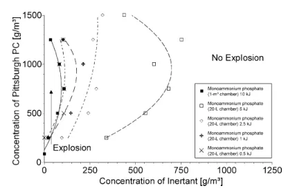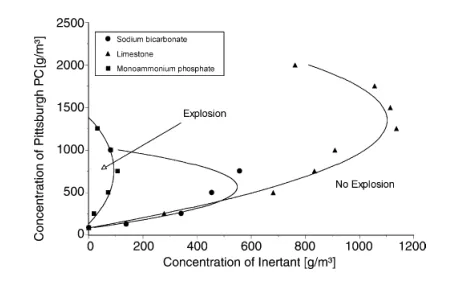 圖 4用碳酸氫鈉,磷酸一銨和石灰石作為惰性物質(zhì)的匹茲堡粉煤灰惰化包膜;實驗是在球形的1-m 3室中使用兩個5 kJ點火器作為點火源進行的(來自Chatrathi和Going,2000年; Dastidar等人,1999年)。