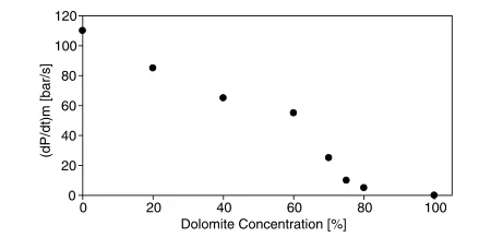 在惰性物質(zhì)組成的框架內(nèi),許多因素很重要:比熱,反應(yīng)熱(分解),分解溫度和分解速率。這些因素中的第一個決定了塵埃云的總熱容量,而另一個決定了涉及惰性物質(zhì)的吸熱分解反應(yīng)的可能性。在以下來自Amyotteand Pegg(1992)的討論中擴展了這些觀點。如Amyotte,Mintz和Pegg(1992)所述,在26升爆炸室內(nèi)使用三種不同的巖石粉塵進行了測試:石灰石(98wt%CaCO3),白云石(w56 wt%CaCO3和w38 wt%MgCO3)和菱鎂礦(14 wt%的CaCO3和81 wt%的MgCO3),目的是確定巖屑分解的相對重要性。惰性劑具有相似的粒度分布,質(zhì)量平均直徑分別為25、30和28 mm。測試的爆炸性粉塵是來自新斯科舍省布雷頓角開發(fā)公司王子煤層的煤粉(質(zhì)量平均直徑為22毫米,揮發(fā)物含量為w35 wt%)。如果吸熱分解反應(yīng)起作用,人們就會預期對石灰石,白云石,菱鎂礦的惰化效果的遞增順序。該排名基于分解溫度,分別為825、750和350℃。