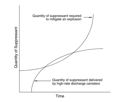 圖 1抑制劑(或惰性劑)的需求量和輸送曲線(來自Moore和Siwek,1992年)如Dastidar和Amyotte(2002)所述,圖1是抑制劑(或惰性劑)緩解爆炸的要求的配圖,以及來自高速率放電罐的抑制劑。緩解爆炸所需的抑制劑量從零時的某個初始值開始,并隨著爆炸火球尺寸的增加而迅速增加。抑制劑的初始量取決于材料特性以及點火源的特性。管線的向上彎曲取決于在給定的容器幾何形狀中火焰通過可爆粉塵傳播的性質(zhì)。在初始延遲后開始從放電罐開始輸送抑制劑,這取決于爆炸檢測系統(tǒng)。然后該曲線迅速增加,并隨著抑制劑推進劑的消耗而開始趨于平穩(wěn)。為了充分抑制爆炸,抑制劑的輸送曲線必須交叉并超過抑制劑的需求曲線。抑制劑輸送曲線的性質(zhì)和曲率取決于抑制劑裝置的設(shè)計特征(例如,檢測器的數(shù)量和類型,排放罐的數(shù)量和尺寸以及排放罐的流量)。確定兩條曲線是否交叉的關(guān)鍵因素是曲線的交點,該交點表示緩解爆炸所需的抑制劑量與縱坐標(即零時的抑制劑要求)相交。該值是惰化水平,或抑菌劑(或惰性劑)和易爆粉塵緊密混合時的抑菌劑要求。無論使用術(shù)語惰性劑還是抑制劑,它都是相同的材料-惰性(即,不可燃)粉塵。重要的區(qū)別在于材料的應(yīng)用-是惰性的還是抑制性的。 Eckhoff(2003)在有關(guān)1990-2002年期間粉塵爆炸研究與開發(fā)的章節(jié)中清楚地闡明了相同的區(qū)別,其中他介紹了不同的部分,標題為:添加不可燃粉塵進行惰化和自動爆炸抑制。正如Eckhoff(2003)所指出的,在過程工業(yè)中,抑制作用比惰化作用更廣泛地應(yīng)用。這是由于在爆炸惰性應(yīng)用中需要將易爆粉塵和惰性粉塵充分預混;這種混合會導致不可接受的產(chǎn)品污染。惰性化在地下煤礦行業(yè)中可能是最普遍的情況,在該行業(yè)中,惰性巖石或石材粉塵(例如石灰石或白云石)與采礦過程中產(chǎn)生的煤粉混合在一起。確實存在其他應(yīng)用(例如,Mintz,Bray,Zuliani,Amyotte和Pegg,1996年,如后所述),尋找非傳統(tǒng)機會利用惰性粉末降低風險的潛力很重要。如本文后面所述,可以通過惰化將散裝粉末加工成危害較小的形式,從而利用固有的適度安全原理(Amyotte,Khan和Dastidar,2003年)。