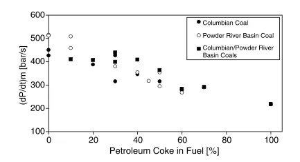 圖 2通過使用煤和石油焦的混合燃料來降低壓力上升速率(來自Amyotte等,2003)。