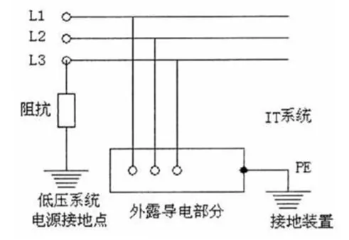 IT系統(tǒng)是中性點(diǎn)不接地,系統(tǒng)中所有設(shè)備的外露可導(dǎo)電部分經(jīng)各自的PE線分別接地。“I”表示配電網(wǎng)不接地或經(jīng)高阻抗接地,“T”表示電氣設(shè)備金屬外殼接地。IT系統(tǒng)適用于環(huán)境條件不良,易發(fā)生單項(xiàng)接地故障的場(chǎng)所,以及易燃、易爆的場(chǎng)所,如醫(yī)院、煤礦、化工、紡織等。IT系統(tǒng)必須裝設(shè)絕緣監(jiān)視及接地故障報(bào)警或顯示裝置。