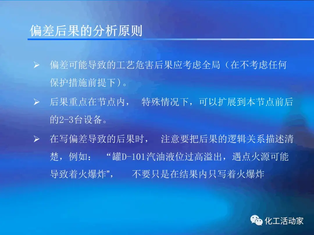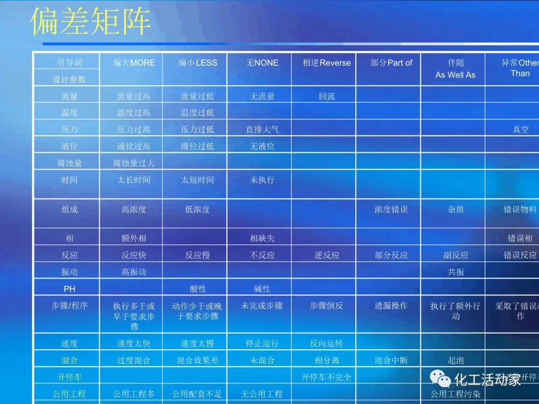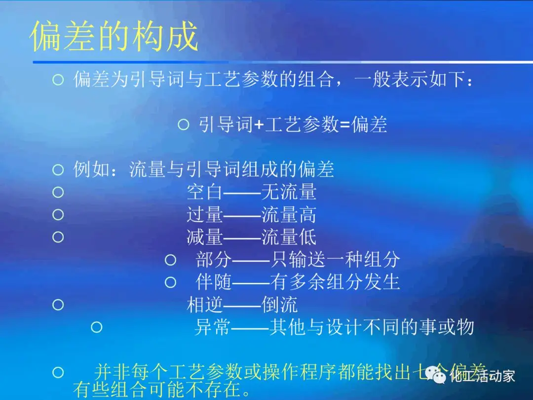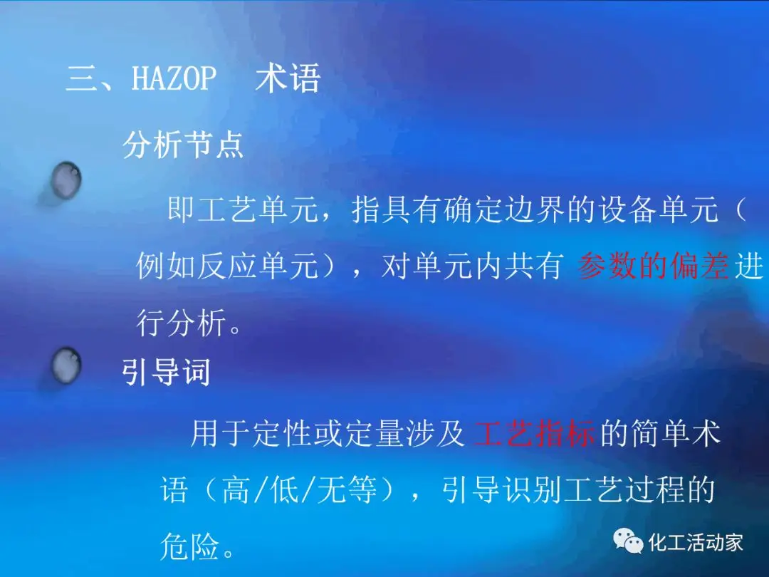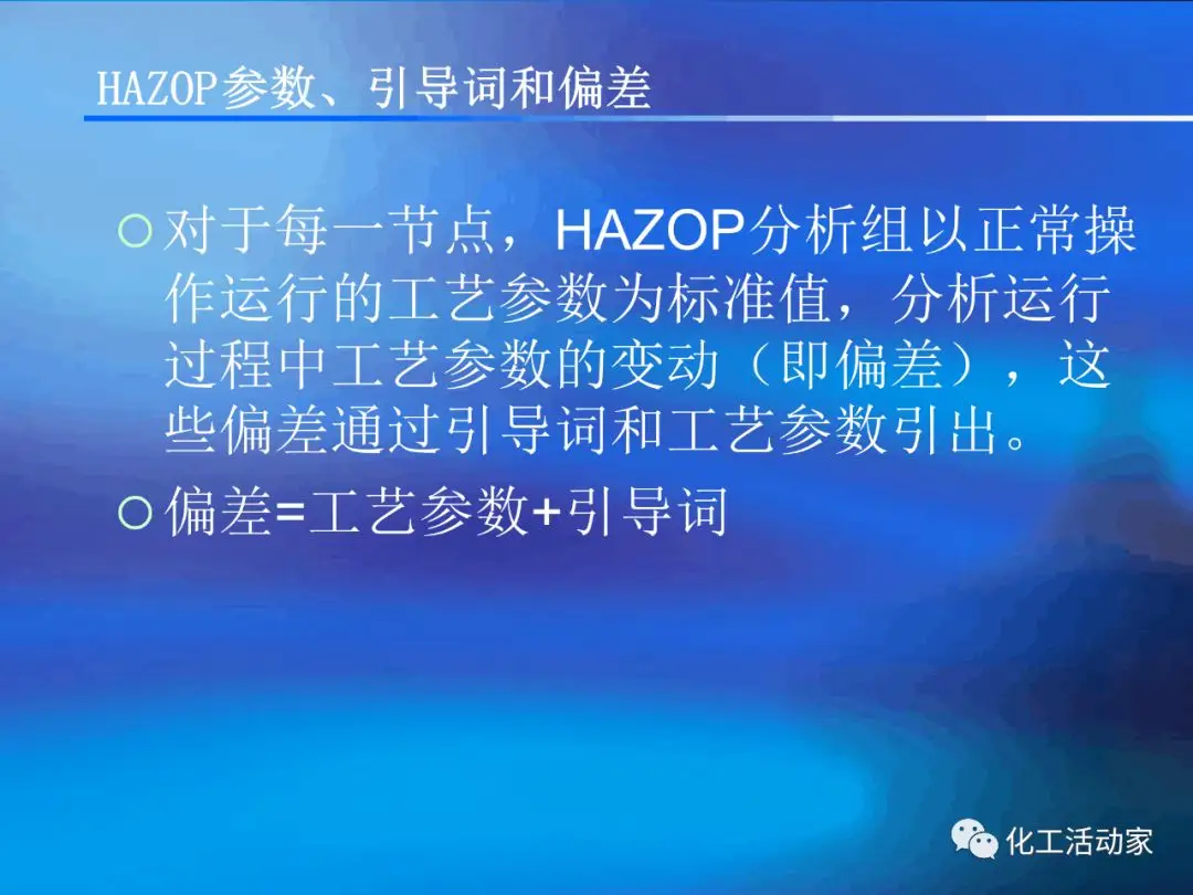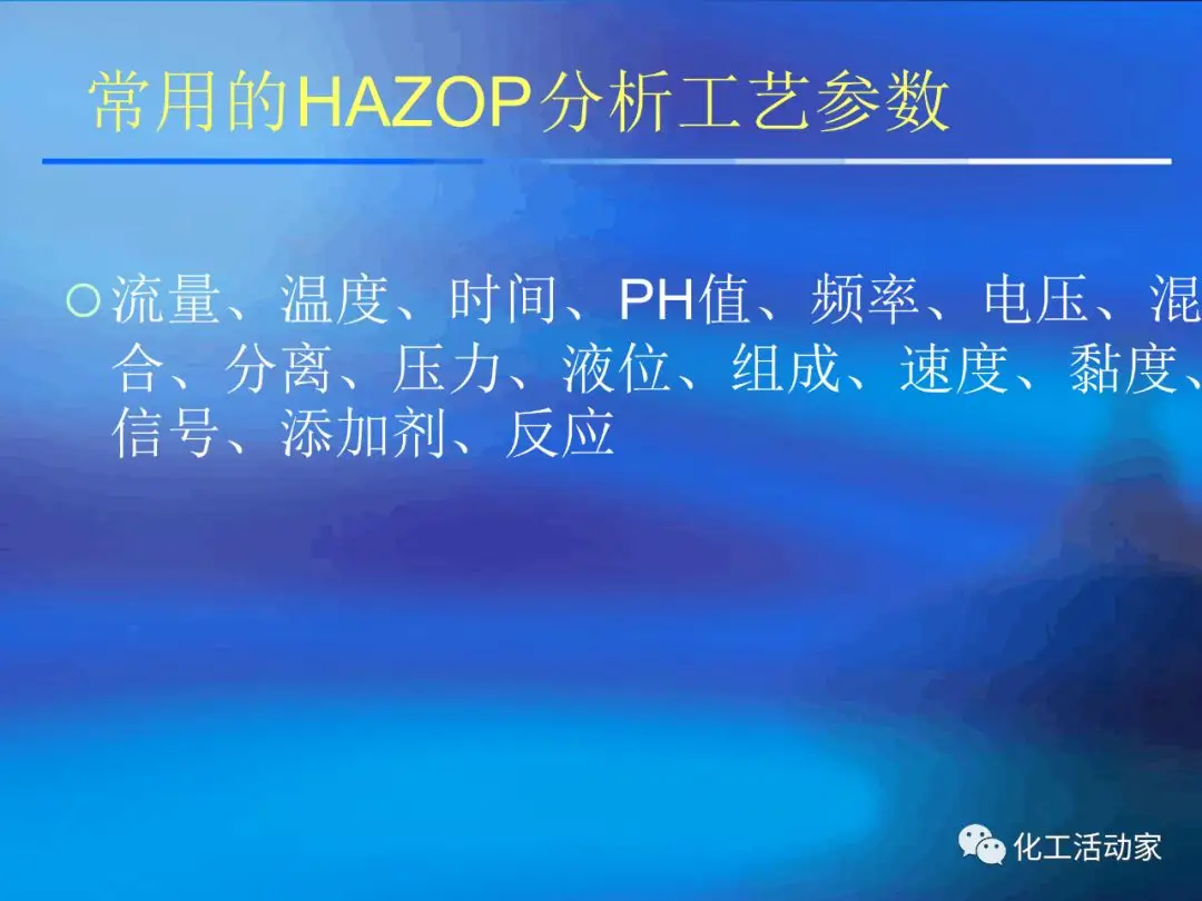 HAZOP分析的基本假設(shè)是“當(dāng)實(shí)際流程在設(shè)計(jì)所允許的最大變動范圍內(nèi)運(yùn)行時,不存在出現(xiàn)危險(xiǎn)和操作問題的可能性”。這是每個HAZOP成員必須牢牢掌握的。