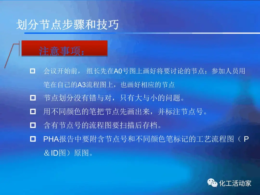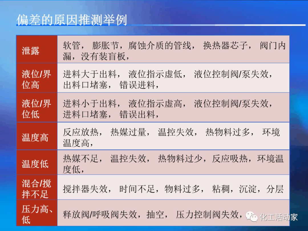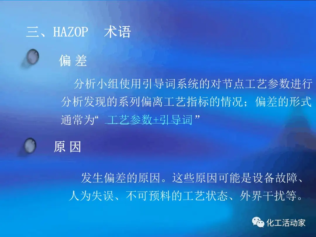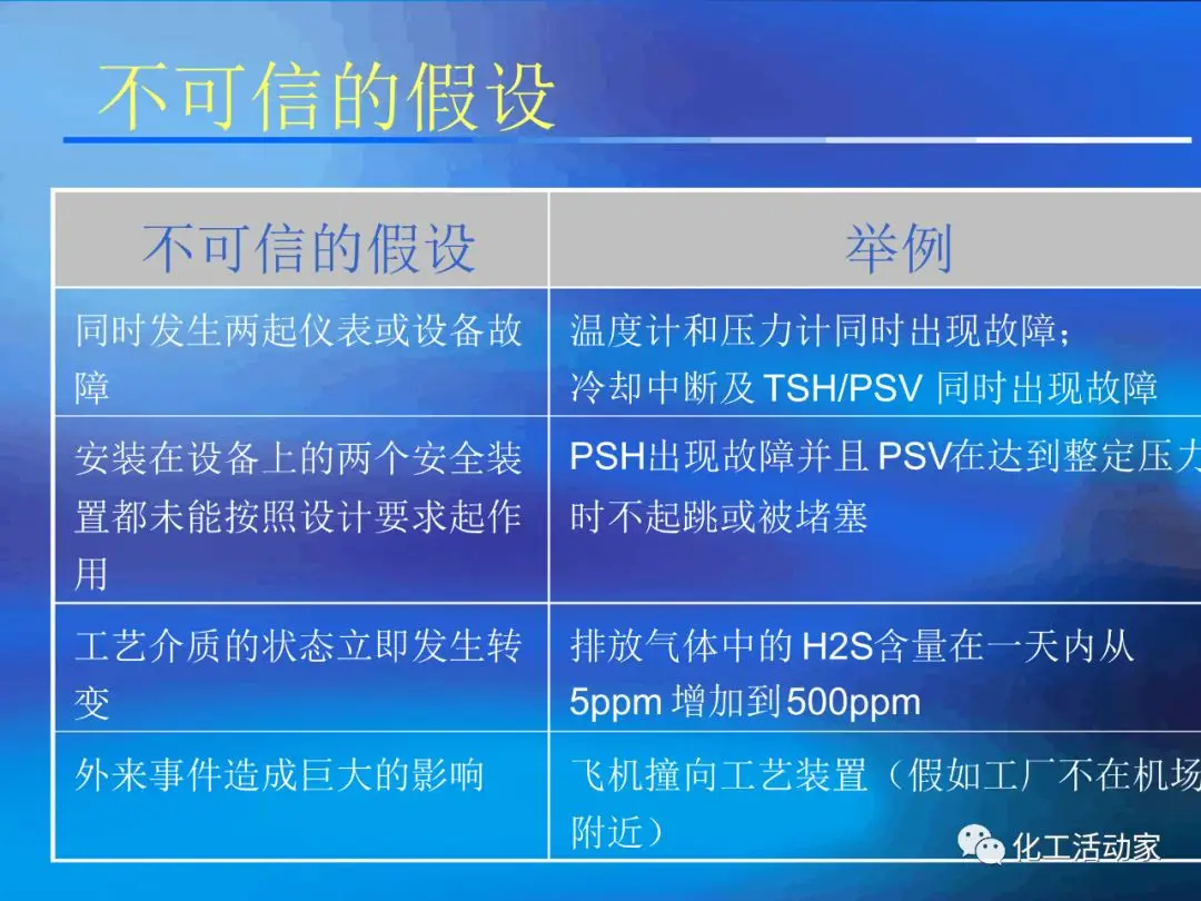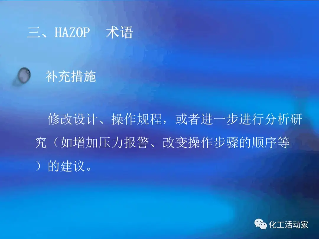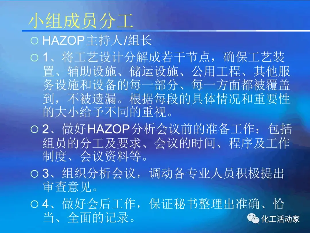 HAZOP分析的基本假設(shè)是“當(dāng)實(shí)際流程在設(shè)計(jì)所允許的最大變動范圍內(nèi)運(yùn)行時,不存在出現(xiàn)危險(xiǎn)和操作問題的可能性”。這是每個HAZOP成員必須牢牢掌握的。