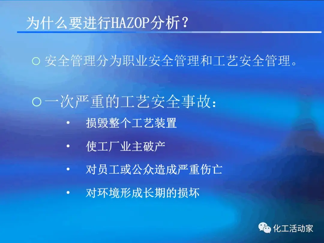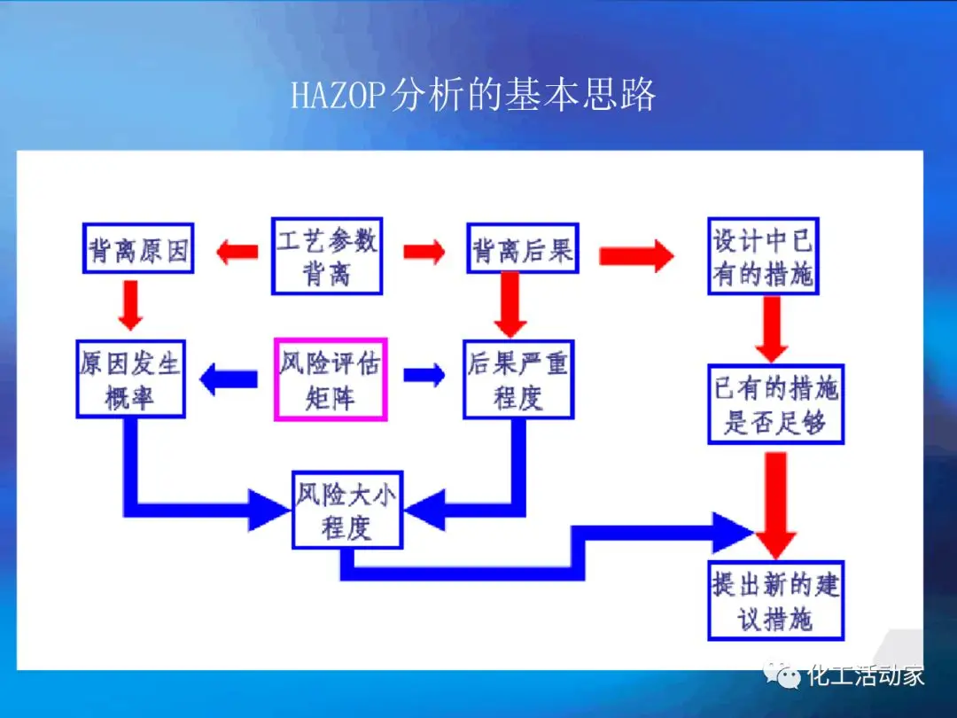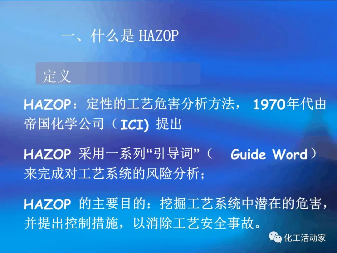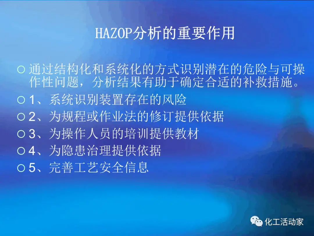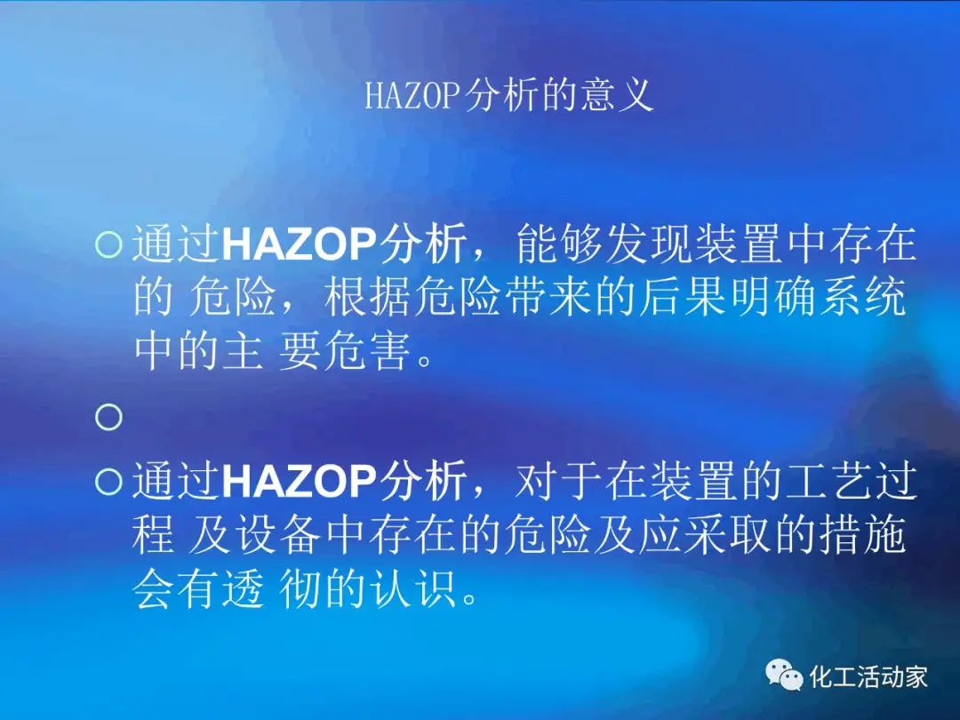 HAZOP分析是一種定性的風(fēng)險(xiǎn)分析方法,其益處很多,如:對分析對象(流程、設(shè)備)的隱患和可操作性進(jìn)行系統(tǒng)、全面的評審;能對誤操作的后果進(jìn)行分析評價(jià)并提出相應(yīng)的預(yù)防措施;能對從未發(fā)生過但可能出現(xiàn)的事故和險(xiǎn)情進(jìn)行預(yù)測性的評價(jià);能改進(jìn)流程設(shè)備的安全性和效率;通過分析的過程能讓參與者分析對象有徹底深入的了解。