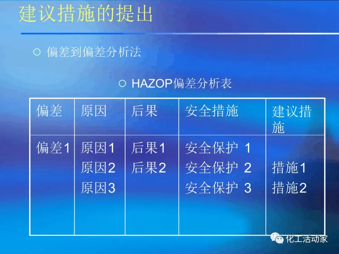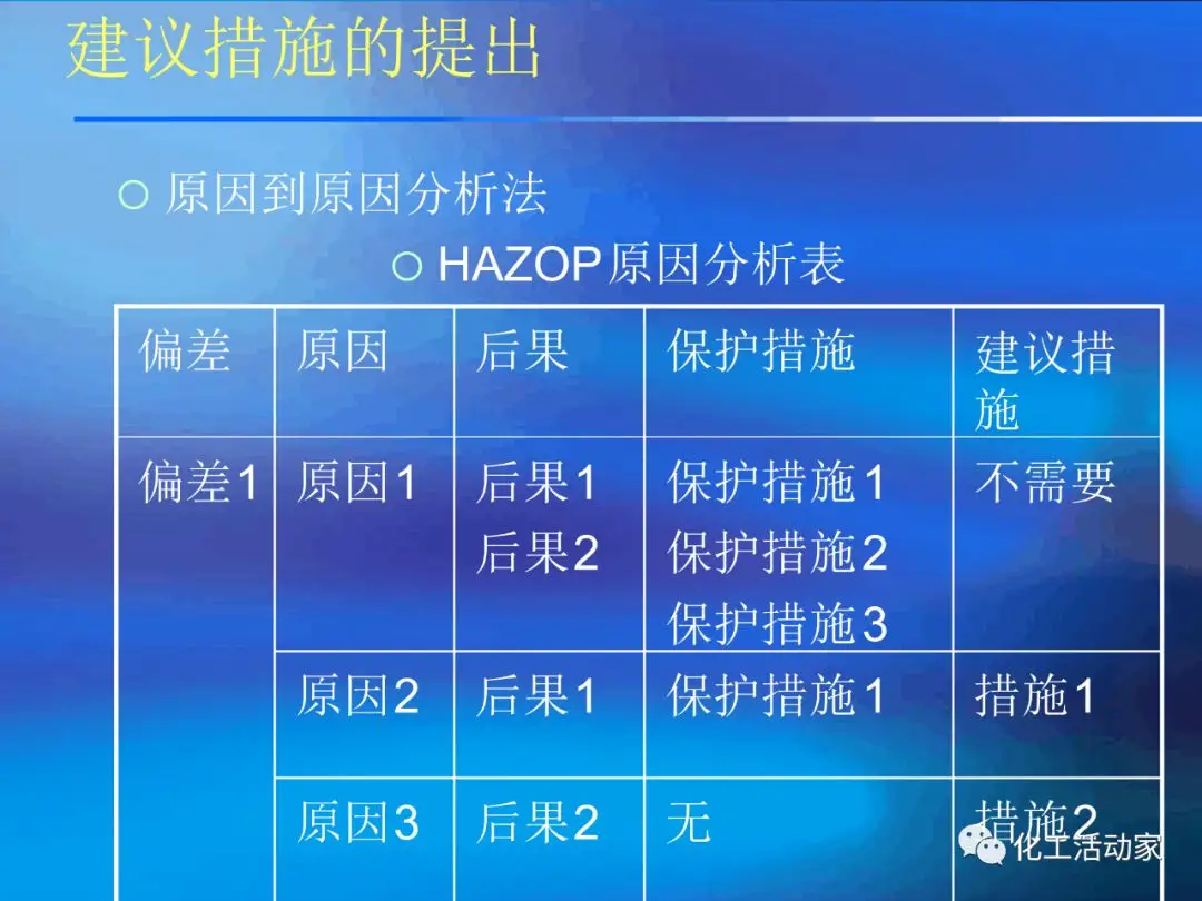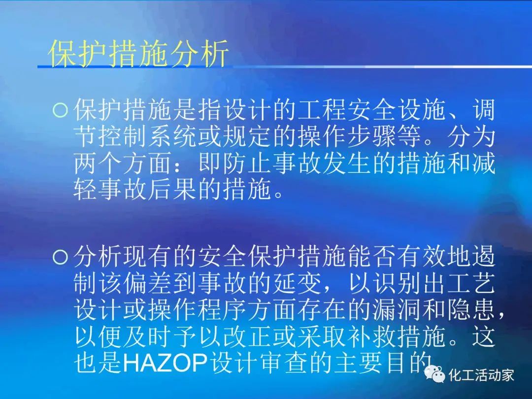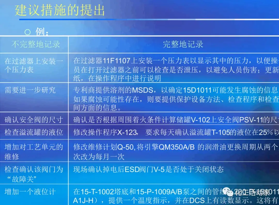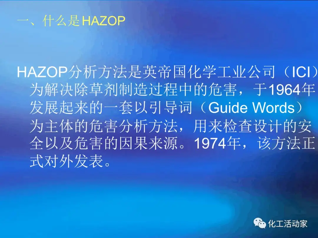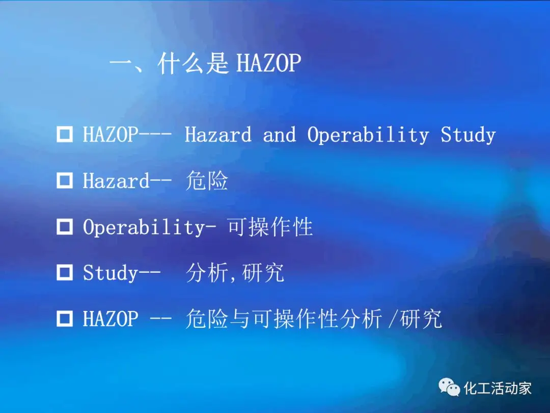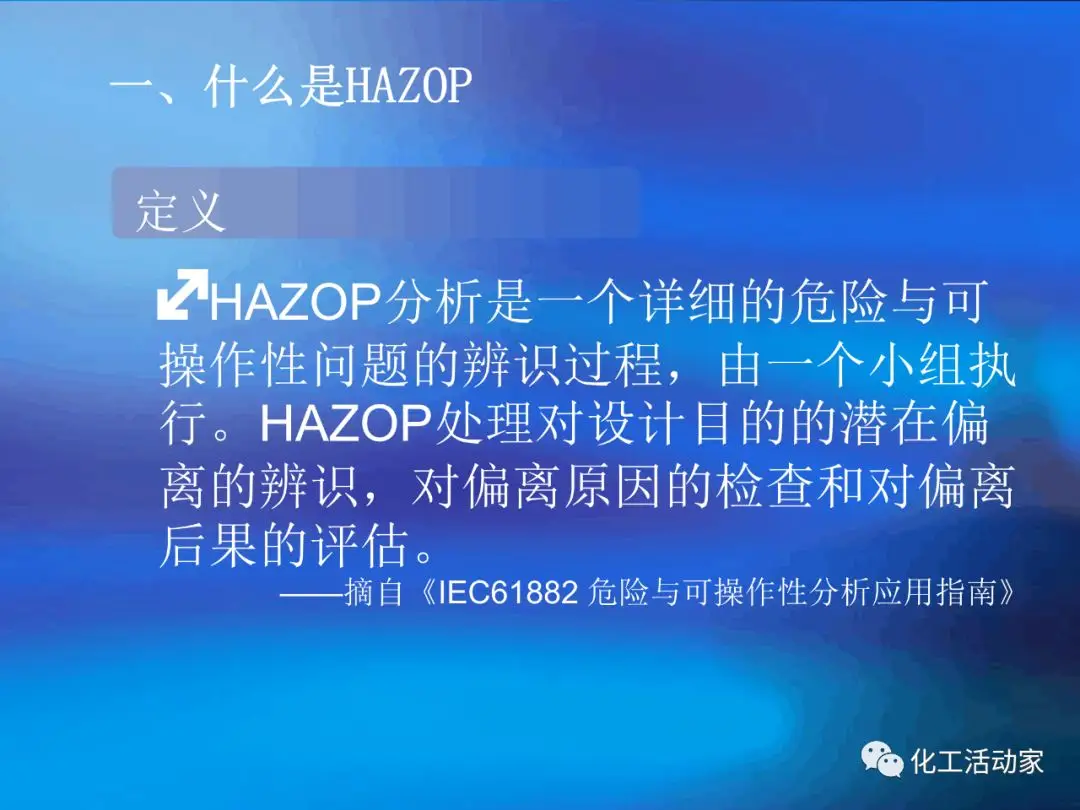 HAZOP的主要目的是對裝置的安全性和操作性進(jìn)行設(shè)計(jì)審查.HAZOP分析由生產(chǎn)管理、工藝、安全、設(shè)備、電氣、儀表、環(huán)保、經(jīng)濟(jì)等工種的專家進(jìn)行共同研究;這種分析方法包括辨識潛在的偏離設(shè)計(jì)目的的偏差、分析其可能的原因并評估相應(yīng)的后果。它采用標(biāo)準(zhǔn)引導(dǎo)詞,結(jié)合相關(guān)工藝參數(shù)等,按流程進(jìn)行系統(tǒng)分析。并分析正常/非正常時可能出現(xiàn)的問題、產(chǎn)生的原因、可能導(dǎo)致的后果以及應(yīng)采取的措施。