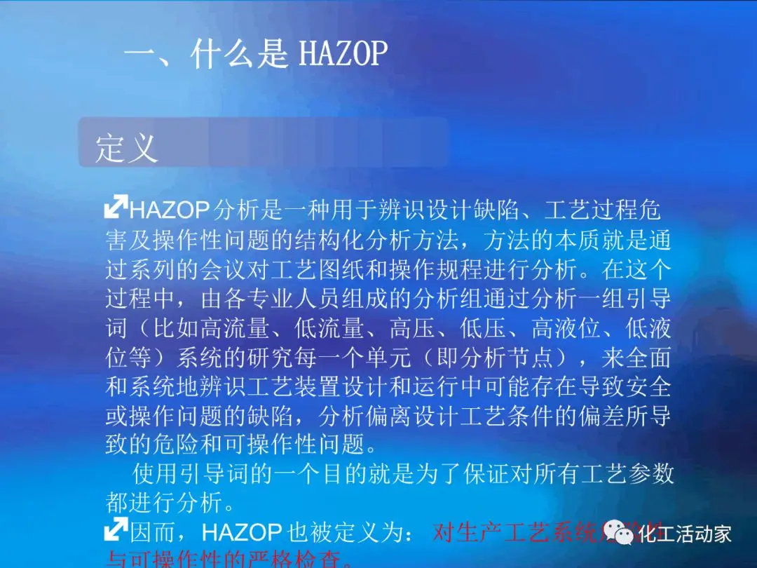 HAZOP分析是由一個多元化的團(tuán)隊(duì),在風(fēng)險(xiǎn)分析師的引導(dǎo)下,采用結(jié)構(gòu)化的方式,通過審查流程,發(fā)現(xiàn)潛在的危害和操作問題。