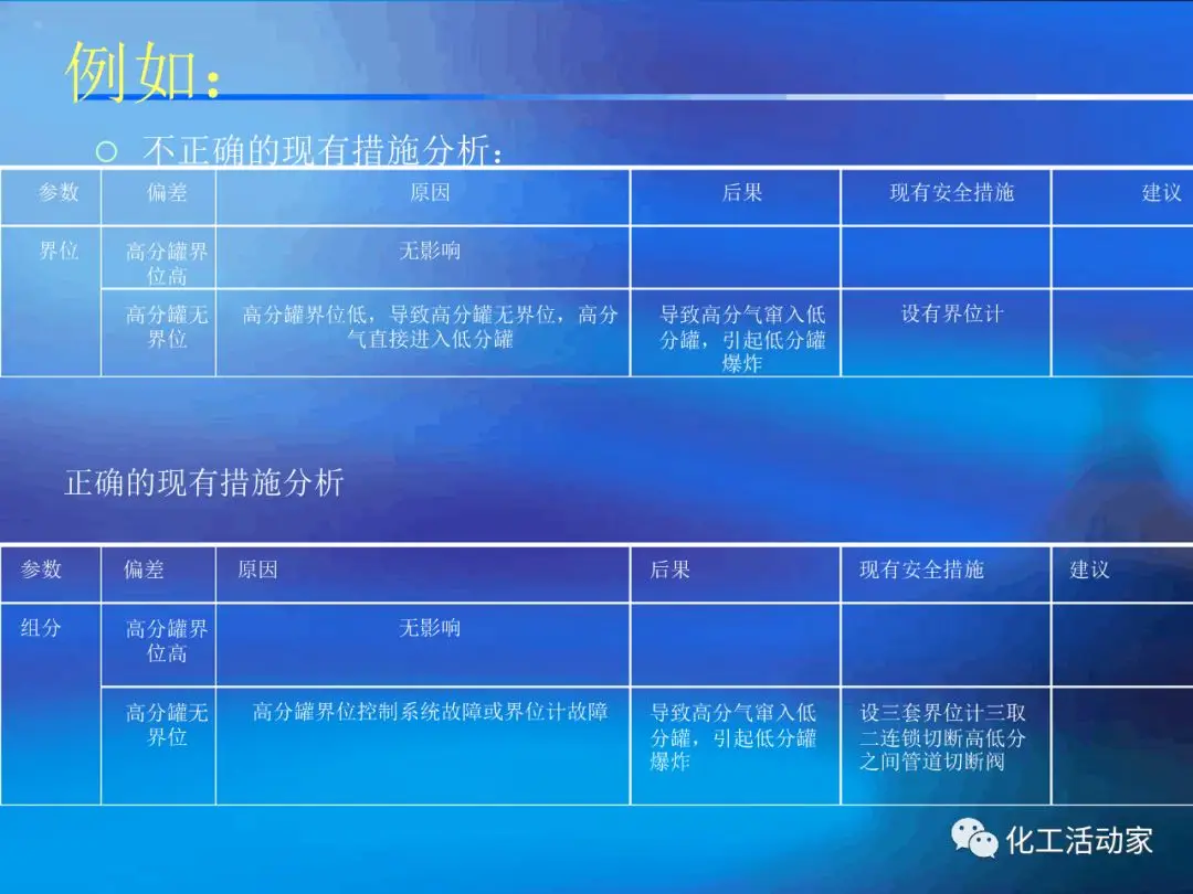 第一步,定義危險(xiǎn)和可操作性分析所要分析的系統(tǒng)或活動。首先要確定分析對象的功能、范圍。因?yàn)樗械奈kU(xiǎn)和可操作性分析所要分析的都是一個系統(tǒng)在正常的運(yùn)行中各種可能的偏差,清楚地定義一個系統(tǒng)的設(shè)計(jì)功能或正常運(yùn)行是分析工作的非常重要的第一步。詳細(xì)和清晰的記錄這第一步工作對HAZOP分析工作是很重要的。在現(xiàn)實(shí)生活中很少有系統(tǒng)是完全孤立的。絕大多數(shù)系統(tǒng)是和其他系統(tǒng)相連或相互作用的。通過清楚地定義一個系統(tǒng)或運(yùn)行的范圍或邊界,可以避免忽略邊界附近重要系統(tǒng)的組成部分;也可以避免囊括不屬于這個系統(tǒng)或運(yùn)行的組成部分從而避免混淆問題或浪費(fèi)資源。需要關(guān)注的問題包括安全問題、環(huán)境問題、經(jīng)濟(jì)問題等。危險(xiǎn)和可操作性分析可以聚焦在一個間題或風(fēng)險(xiǎn)上,也可以同時聚焦在幾個問題上。在分析的時候還需要考慮可接受的風(fēng)險(xiǎn)限度。第三步,分解被分析的系統(tǒng)并且建立偏差。在整個HAZOP團(tuán)隊(duì)集中開會之前,HAZOP團(tuán)隊(duì)的LEADER和記錄員應(yīng)該作一些積極的準(zhǔn)備工作來確保團(tuán)隊(duì)開會的時間得到充分的利用。這些準(zhǔn)備工作包括:定義系統(tǒng)的組成部分(流程的節(jié)點(diǎn))、建立可信的偏差、建立HAZOP工作表。一個有結(jié)構(gòu)的HAZOP分析的規(guī)程是遵照特殊的引導(dǎo)詞的方法。有兩種方式識別偏差:參數(shù)方法和設(shè)計(jì)意圖方法。參數(shù)方法討論節(jié)點(diǎn)設(shè)計(jì)意圖,選擇相關(guān)流程參數(shù),然后將引導(dǎo)詞與參數(shù)結(jié)合,創(chuàng)造偏差。設(shè)計(jì)意圖方法是團(tuán)隊(duì)領(lǐng)導(dǎo)從設(shè)計(jì)意圖創(chuàng)造偏差。設(shè)計(jì)意圖方法是團(tuán)隊(duì)領(lǐng)導(dǎo)從設(shè)計(jì)意圖中提煉出關(guān)鍵的外在特征和參數(shù),創(chuàng)造潛在的偏差。(3)確認(rèn)節(jié)點(diǎn)1。(4)分析團(tuán)隊(duì)確立節(jié)點(diǎn)1的設(shè)計(jì)意圖。(5)對節(jié)點(diǎn)1應(yīng)用第一個偏差,并且問分析團(tuán)隊(duì),“這個偏差的后果會是什么?”允許團(tuán)隊(duì)成員花一點(diǎn)時間來考慮這個系統(tǒng)偏差的問題。有時候可能需要允許提示來促動討論。如果這個偏差不會導(dǎo)致事故,對第二個偏差重復(fù)這一個步驟。如果討論的偏差不會導(dǎo)致事故,就沒有必要考慮原因或安全裝置。(6)當(dāng)分析團(tuán)隊(duì)討論完這個偏差所可能導(dǎo)致的所有需要分析的事故后,將討論轉(zhuǎn)為考慮那些造成偏差的原因。(7)辨識用來防止和延緩系統(tǒng)的偏差的工程裝置和管理控制。分析團(tuán)隊(duì)的討論應(yīng)該包括考慮到這些裝置和控制可以是防止性的(即它們幫助防止偏差的發(fā)生)或延緩性的(即它們幫助減輕那些偏差所導(dǎo)致的事故的嚴(yán)重性)。(8)如果分析團(tuán)隊(duì)認(rèn)為對一些系統(tǒng)的偏差的安全裝置不夠充分,分析團(tuán)隊(duì)就必需提出推薦建議。防止和延緩系統(tǒng)的偏差包括安全裝置的數(shù)量,類型和有效性。(10)對這個節(jié)點(diǎn)所有的偏差重復(fù)步驟"(5)”到“(9)”。(11)對所有的節(jié)點(diǎn)重復(fù)步驟+(3)”到“(10)”。以上的工作內(nèi)容,全部要記到工作表中。記錄員負(fù)責(zé)文檔的建立。咨詢公司一般采用專門的HAZOP記錄軟件,如HazardReview-Leader,PHA-Works,PHA-Pro等。其中HazardReview一Leader是美國ABS(美國船級社)專門進(jìn)行危險(xiǎn)辨識設(shè)計(jì)的軟件,它會議記錄方便,確保措詞一致。第五步,運(yùn)用HAZOP分析的結(jié)果進(jìn)行決策。HAZOP分析的結(jié)果可用來決策。首先,要根據(jù)HAZOP分析的結(jié)果來確定被分析系統(tǒng)的風(fēng)險(xiǎn)的可接受性,即系統(tǒng)有沒有符合預(yù)先設(shè)立的風(fēng)險(xiǎn)的可接受性標(biāo)準(zhǔn)一般可采用風(fēng)險(xiǎn)矩陣的方法,并根據(jù)以分析的結(jié)果來確定對這個系統(tǒng)的風(fēng)險(xiǎn)的最大貢獻(xiàn)的組成部分子系統(tǒng)或步驟。這些子系統(tǒng)或步驟是考慮改進(jìn)機(jī)會的最主要的對象。其次,對系統(tǒng)風(fēng)險(xiǎn)的最大貢獻(xiàn)的子系統(tǒng)或步驟提出具體的和切實(shí)可行的改進(jìn)建議,例如設(shè)備改進(jìn)、操作程序改進(jìn)。行政措施改進(jìn)。譬如,預(yù)防性的維修計(jì)劃、人員培訓(xùn)等。同時也要估算貫徹昂貴或較有爭議的改進(jìn)建議對未來運(yùn)行的影響,對貫徹這些建議作費(fèi)用效益比較;在比較時,不要忘記考慮貫徹這些建議的整個生命周期的效益和費(fèi)用。另外,HAZOP分析如果在跟蹤措施責(zé)任上缺乏溝通,那么其效果會大大降低。HAZOP分析產(chǎn)生大量的工作表,其中掩藏了許多重要的條款,所以總結(jié)報(bào)告是很重要的。總結(jié)報(bào)告應(yīng)能夠告訴讀者分析的目標(biāo)、范圍,描述完成了什么,最重大的發(fā)現(xiàn)是什么。HAZOP跟蹤要分配到人和部門。最有效的溝通是來自最高管理層,分析團(tuán)隊(duì)要準(zhǔn)備給最高管理層一個有效的報(bào)告,這個報(bào)告要鮮明地體現(xiàn)出管理層要承諾和決策的行動。