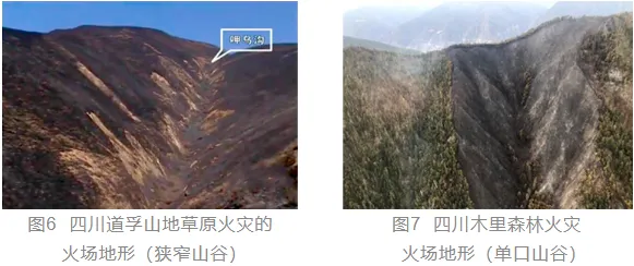 當(dāng)森林不充分燃燒所產(chǎn)生的可燃?xì)怏w濃度達(dá)到爆炸下限或低于爆炸上限時(shí),爆燃才有可能發(fā)生。但在野外開放環(huán)境中,尤其是地勢(shì)相對(duì)平坦、通風(fēng)良好的地形,可燃?xì)怏w幾乎很難達(dá)到爆炸極限。而相對(duì)封閉的峽谷地形(如單口山谷、狹窄山谷、山洼、草塘溝),則有利于可燃?xì)怏w的聚集,為爆燃的發(fā)生提供了有利的前提。2010年“12·5”四川道孚山地草原火災(zāi)就是發(fā)生在一條常年流水沖刷而成的狹窄山谷(呷烏溝)內(nèi),消防隊(duì)員在清理溝內(nèi)余火時(shí),火場(chǎng)突起大風(fēng),引發(fā)林火爆燃,最終造成重大人員傷亡(如圖6所示)。2019年“3·30”四川木里森林火災(zāi)則發(fā)生在三面環(huán)山、坡陡溝深的單口山谷中,消防員清理谷內(nèi)煙點(diǎn)時(shí),風(fēng)力風(fēng)向突變,突發(fā)爆燃,最終造成人員遇難(如圖7所示)。